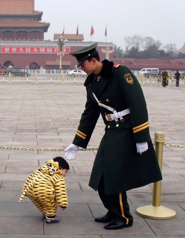 مزاحمت یک خردسال چینی برای پلیس . این کودک خردسال می خواهد به اصرار وارد منطقه ای ممنوعه در میدان " تیان آن من " پکن شود که به خاظر برگزاری اجلاس سالانه مجمع ملی چین زنجیر کشی شده است