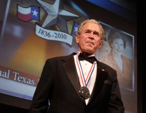 جورج بوش رییس جمهور پیشین آمریکا در حال دریافت مدال " تاریخ ساز " از موزه ایالتی تگزاس درشهر " آستن "