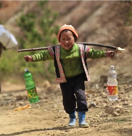 کودک روستایی چینی در حال حمل بطری های آب آشامیدنی