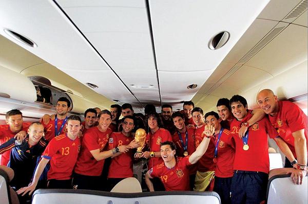 تیم ملی فوتبال اسپانیا با کاپ قهرمانی در داخل هواپیما(عکس)