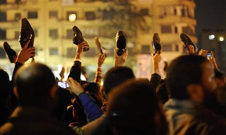 عصر ایران - حدود سه میلیون نفر از مردم معترض در میدان تحریر قاهره پنجشنبه شب سخنرانی حسنی مبارک رئیس جمهور مصر را پیگیری می کردند. در این تصویر تعدادی از معترضین به نشانه مخالفت و اعتراض کفش های خود را در هنگام سخنرانی مبارک بالا بردند.
