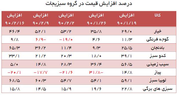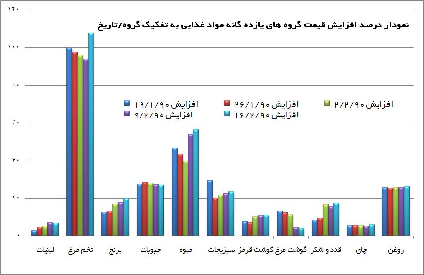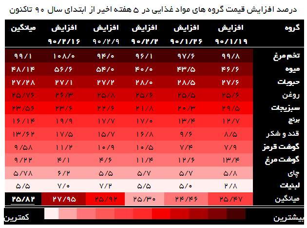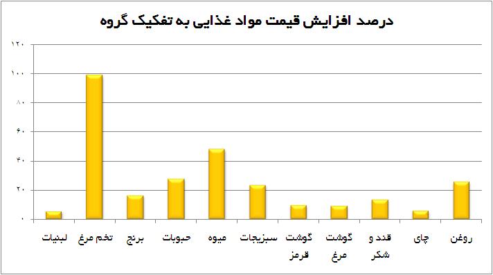 به گزارش فردا در این جداول قیمت "نان" ذکر نشده است. بر اساس این جداول به ترتیب گروه های: تخم مرغ با 99 درصد، میوه با 48 درصد، حبوبات با 27 درصد، روغن با 26 درصدت، سبزیجات با 24 درصد، برنج با 16 درصد، قند و شکر با 14 درصد، گوشت قرمز با 10 درصد، گوشت مرغ با 9 درصد، چای با 6 درصد و لبنیات با 7 درصد افزایش، یازده گروهی هستند که در 5 هفته اخیر(از اولین هفته سال جدید یعنی 19 فروردین که آمار منتشر شده است تا 16 اردیبهشت که اخرین امار منتشر شده است) افزایش قیمت داشتند.