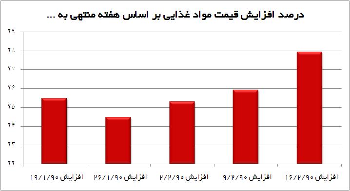 در یک نگاه کلی میتوان بر اساس آمارهای هفتگی بانک مرکزی از قیمت خرده فروشی مواد غذایی در پایتخت چنین نتیجه گرفت که در مجموع میانگین افزایش قیمت مواد خوراکی در تهران حدود 26 درصد از ابتدای سال 90 تا کنون، نسبت به مدت مشابه سال پیش افزایش داشته است.