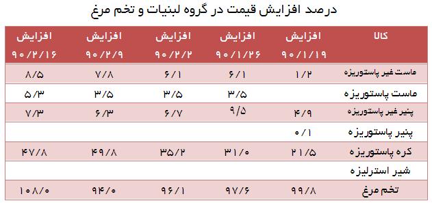 در بین گروه های های مورد ذکر در گزارش، لبنیات کمترین و تخم مرغ بیشترین افزایش قیمت را داشته است. ماست پاستوریزه در هفته اول مورد بررسی این گزارش 2/1(یک ممیز2) درصد، در هفته دوم 1/6(6ممیز1) درصد، در هفته سوم 1/6(6ممیز1) درصد، در هفته چهارم 8/7(7ممیز8) درصد و در هفته پنجم 5/8(8ممیز 5) درصد افزایش نسبت به هفته های مشابه در سال 89 داشته اند.