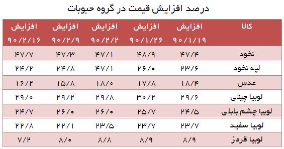 گروه حبوب در کل 28/27(27 ممیز28) درصد در پنج هفته مورد بحث در اینجا، نسبت به مدت مشابه افزایش قیمت داشته است. بیشترین تغییر قیمت در سومین گروه افزایش قیمت ها در هفته منتهی به 28 فروردین رخ داده است.