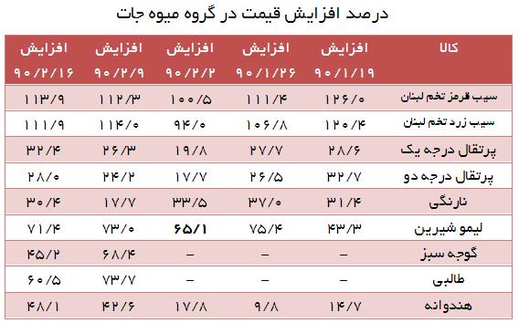 گروه میوه جات با 14/48 (48ممیز14) درصد افزایش، دومین گروهی است که از ابتدای امسال تاکنون بیشترین رشد قیمت را داشته است. در هفته منتهی به 16 اردیبهشت، بیشترین و در هفته منتهی به 2 اردیبهشت کمترین افزایش قیمت در این گروه مشاهده می شود. در بین میوه های موجود در این گروه، سیب بیشترین رشد قیمت ها را داشته است.