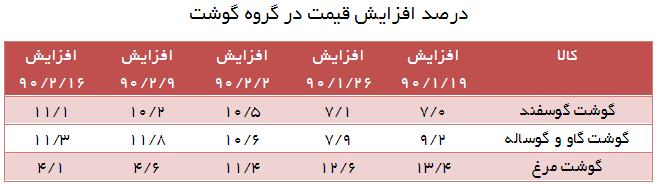 گوشت گاو و گوساله در هفته منتهی به 19 فروردین ۹/۲ (9ممیز2) درصد، در هفته منتهی به 26 فروردین ۷/۹ (7ممیز9) درصد، در هفته منتهی به 2 اردیبهشت۱۰/۶ (10ممیز6) درصد، در هفته منتهی به 9 اردیبهشت ۱۱/۸ (11ممیز8) درصد، در هفته منتهی به 16 اردیبهشت۱۱/۳ (11ممیز3) درصد، افزایش قیمت داشته است.
