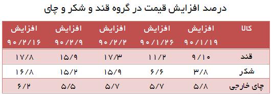 شکر در هفته منتهی به 19 فروردین ۳/۸ (3ممیز8) درصد، در هفته منتهی به 26 فروردین ۶/۶ (6ممیز6) درصد، در هفته منتهی به 2 اردیبهشت۱۵/۹ (15ممیز9) درصد، در هفته منتهی به 9 اردیبهشت ۱۵/۲ (15ممیز2) درصد، در هفته منتهی به 16 اردیبهشت۱۶/۸ (16ممیز8) درصد، افزایش قیمت داشته است.