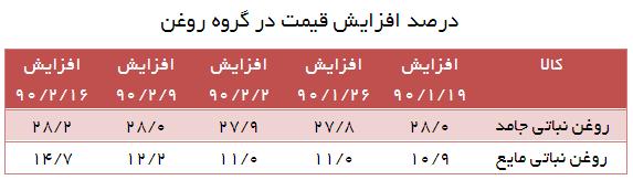 روغن نباتی مایع در هفته منتهی به 19 فروردین ۱۰/۹ (10 ممیز9) درصد، در هفته منتهی به 26 فروردین 11 درصد، در هفته منتهی به 2 اردیبهشت 11 درصد، در هفته منتهی به 9 اردیبهشت ۱۲/۲ (12ممیز2 ) درصد، در هفته منتهی به 16 اردیبهشت ۱۴/۷ (14ممیز7 ) درصد، افزایش قیمت داشته است.