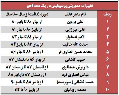 در اين بين صندلي مديريت پرسپوليس يكي از متزلزل ترين صندلي هاي تاريخ فوتبال بوده است. جايي كه در در طول 10 سال گذشته يازده بار مدیر عامل خود را تغییر داده که در طی آن 8 نفر مدیریت این باشگاه را برعهده گرفته و پس از گذشت مدت کوتاهی تیم را به دیگران واگذار کرده اند.