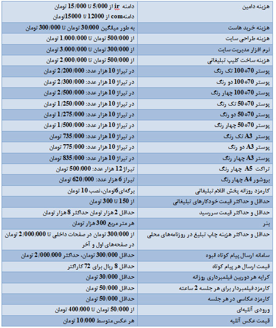اینکه نامزدهای انتخاباتی چقدر هزینه می‌کنند تا رای بیشتر مردم را در سبد خود قرار دهند اصلا مشخص نیست و کمتر نامزدی پیدا می‌شود که هزینه ستاد‌های تبلیغاتیش را بیان کند؛ اما برای آنکه در روزهای آینده قیمت اقلامی که در و دیوار شهرها رو دربر می‌گیرد داشته باشید، موارد مصرفی در این روزها در جدولی آورده شده است