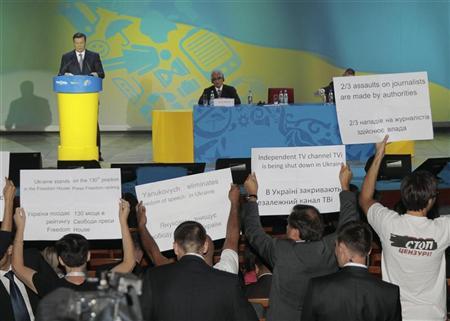 رویترز اضافه کرد: آنها هنگامی دست به این اقدام زدند که رئیس جمهور "ویکتور یانکویچ" در همایش جهانی مطبوعات در کیف، روند حرکت کشورش در زمینه آزادی رسانه ها را در خور تقدیر دانست و از این روند ابراز خرسندی کرد.