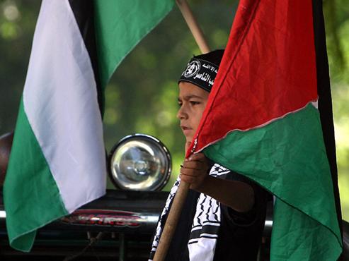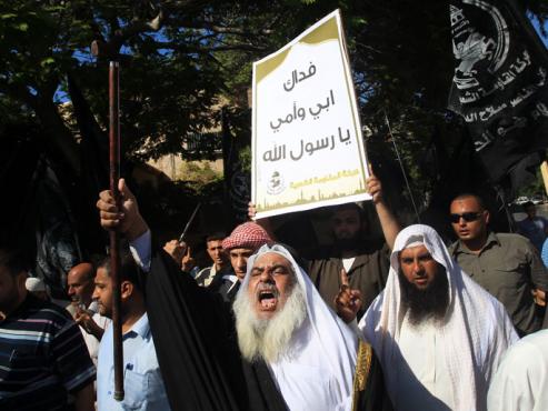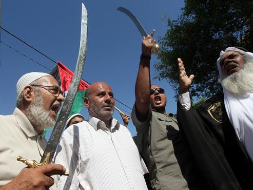 اعتراضات در غزه در مقابل دفتر نمایندگی سازمان ملل متحد و اشاره با چاقو به طرف عکس کارگردان فیلم ضداسلامی