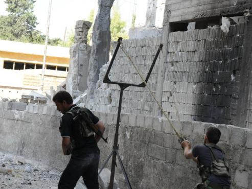 عصر ایران - یکی از مخالفان مسلح در سوریه در حال پرتاب نارنجک با استفاده از وسیله ابتکاری خود.