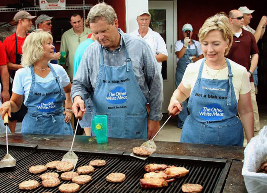 هیلاری کلینتون کاندیدای حزب دمکرات برای انتخابات ریاست جمهوری آمریکا (همسر بیل کلینتون رئیس جمهور سابق ایالات متحده)در حال آشپزی در فضای آزاد و مقابل دوربین ها در کنار یک زوج دیگر که دوست خانوادگی او هستند.