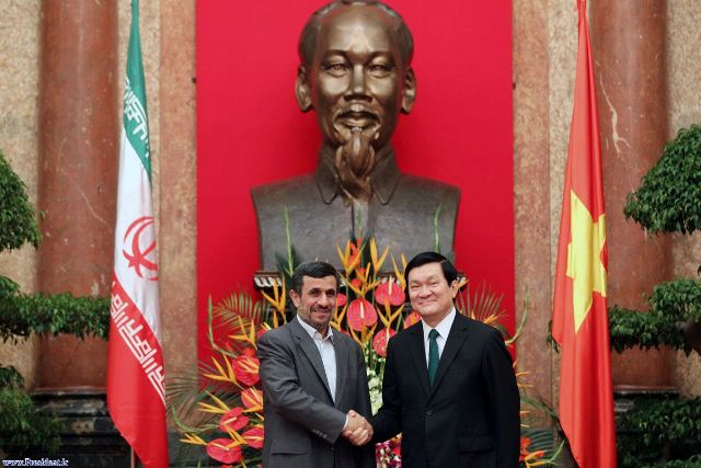 عصر ایران - در سفر محمود احمدی نژاد رئیس جمهور به ویتنام و دیدار با مقامات این کشور، در پرچم مورد استفاده برای ایران، به جای کلمات الله اکبر در حاشیه دو رنگ سبز و قرمز در بالا و پایین، نقاشی های بی معنی به چشم می خورد.
