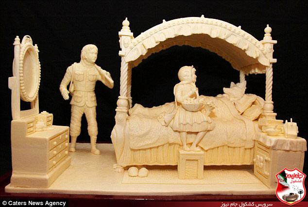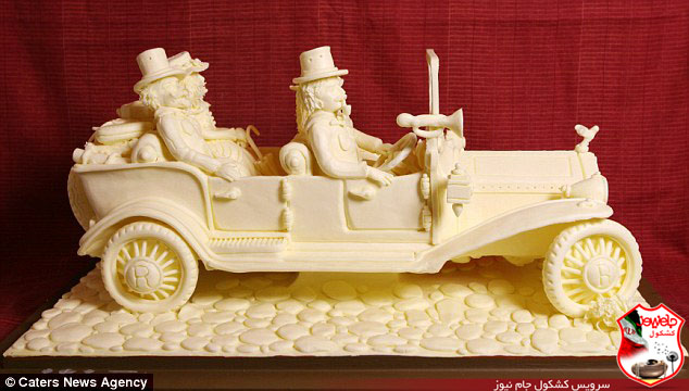 محصولی از رولز رویس و صحنه ای بیاد ماندنی از شنل قرمزی دو مجسمه ای است که این هنرمند خلاق با استفاده از کره ساخته است.