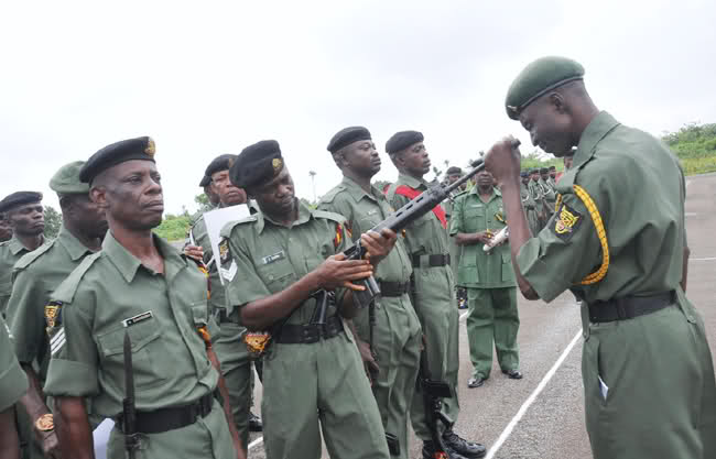 در اين عكس گروهبان یکم هنگ ارتش نيجريه در حال چك كردن اسلحه يكي از سربازان، براي آماده سازي در مراسم مي باشد.