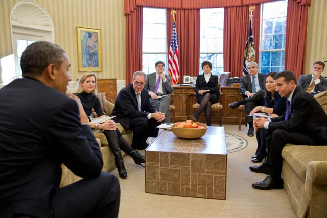 عصر ایران - جلسه باراک اوباما باجمعی از مقامات کاخ سفید و کابینه خود در اتاقش در کاخ سفید. (منبع: وب سایت کاخ سفید)