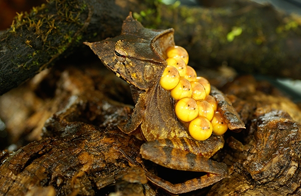 این قورباغه درختی کلاهخوددار با نام علمی Hemiphractus fasciatus توده‌ای از تخم‌های زردرنگش را بر روی پشتش حمل می‌کند.