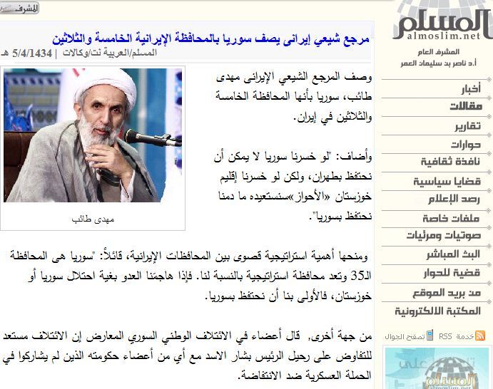 آیا آقای طائب منکر این قضیه هستند که ادعای استان بودن سوریه در اظهارات یکی از شخصیت های حکومتی کشورمان تا چه میزان می تواند با ریختن آب به آسیاب دشمن، نه تنها کمکی به حکومت سوریه نباشد بلکه سبب تضعیف موقعیت آن در برابر مخالفان داخلی باشد؟!