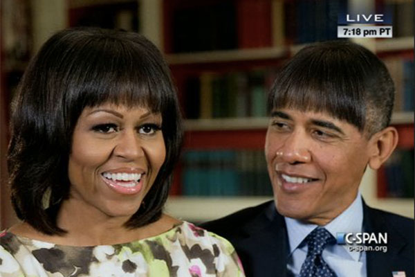 اما شاید خنده‌دار ترین لحظه برای خبرنگاران در این جلسه زمانی بود که اوباما عکس‌هایی مونتاژ شده از خودش را نمایش داد که در آنها از موهای همسرش استفاده شده بود!