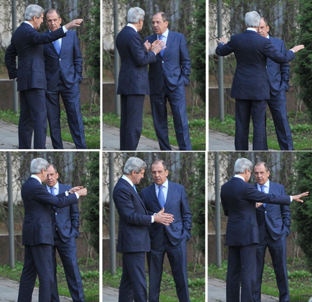 عصر ایران - جان کری وزیر امور خارجه آمریکا در محوطه باغ ساختمان وزارت خارجه  روسیه در مسکو در حال گفتگو با " سرگئی لاوروف " همتای روس خود درباره بحران سوریه است. آمریکا تلاش دارد تا   مسکو سیاست خود را در حمایت از حکومت بشار اسد تغییر دهد.