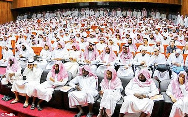 این عکس که به تازگی در شبکه های اجتماعی منتشر شده است مربوط به یک سال پیش و در جریان کنفرانسی در دانشگاه "قسیم" در عربستان سعودی است. موضوع این جلسه "زنان در جامعه" بوده است و البته تمام شرکت کنندگان در مراسم مرد هستند.