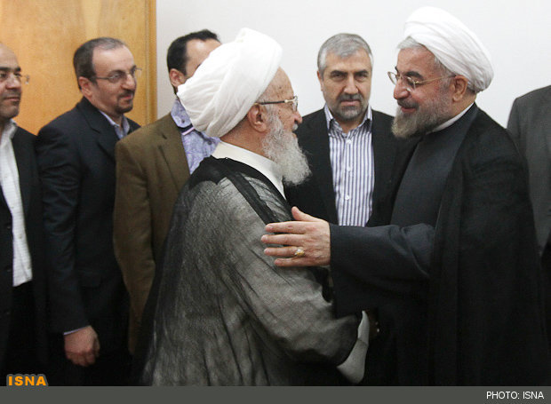 خوش و بش آیت الله مکارم با روحانی (عکس)
