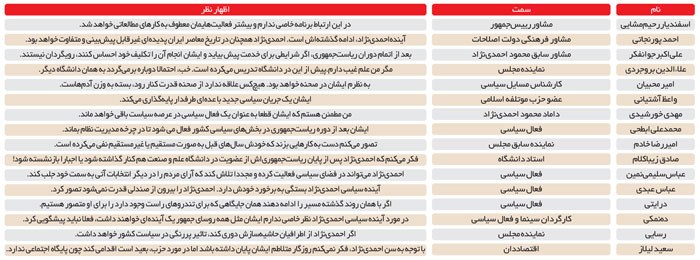 احمدی‌نژاد پس از پایان دوره ریاست‌جمهوری‌اش چه خواهد کرد؟ به دانشگاه بازمی‌گردد؟ حزب تاسیس می‌کند؟ در عرصه سیاسی خواهد ماند یا برای همیشه این عرصه را ترک خواهد کرد؟ مشایی چه می‌کند؟ مرد حاشیه‌ساز دولت که احمدی‌نژاد در مورد او می‌گوید «مشایی یعنی احمدی‌نژاد، احمدی‌نژاد یعنی مشایی» اینها پرسش‌هایی است که درباره آینده سیاسی احمدی‌نژاد مطرح می‌شوند. این روزها آینده سیاسی احمدی‌نژاد و چینش کابینه روحانی نقل محافل مختلف سیاسی و خبری است.