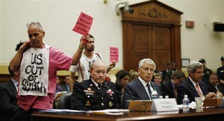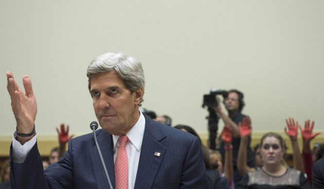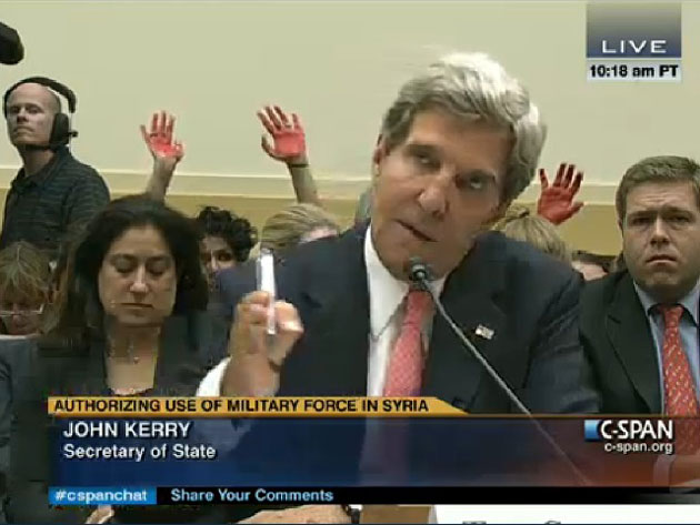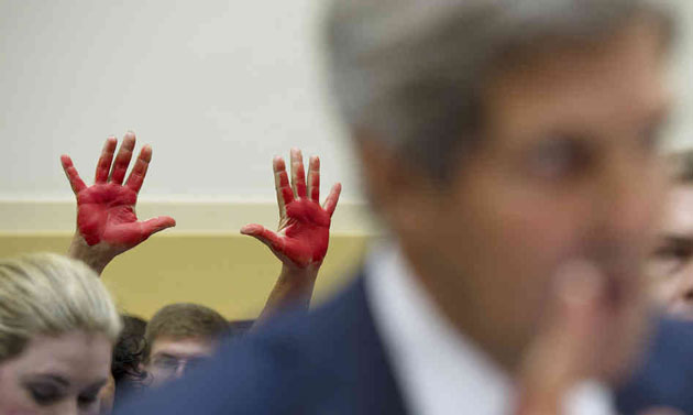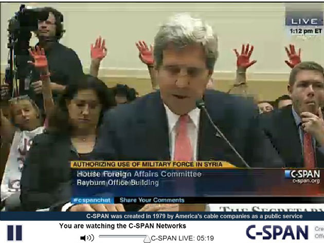 عصر ایران - در جلسه روز گذشته کمیته روابط خارجی سنای آمریکا که به منظور استماع سخنان وزرای خارجه و دفاع آمریکا و نیز رییس ستاد مشترک ارتش این کشور درباره حمله احتمالی به سوریه بود، گروهی از مخالفان جنگ که دستان خود را به نشانه خون به رنگ قرمز در آورده بودند، به هنگام سخنرانی جان کری وزیر خارجه دست های خود را بالا برده و اعتراض کردند.