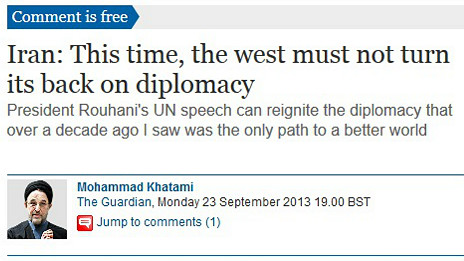 محمد خاتمی رئیس جمهور پیشین ایران با نگارش مقاله ای در روزنامه بریتانیایی گاردین با عنوان "غرب به دیپلماسی ایران پشت نکند" گفت: انتخاب حسن روحانی، سیاستمدار میانه روی ایرانی به عنوان رئیس جمهور این کشور، فرصتی استثنایی برای ایران و غرب پدید آورده است.