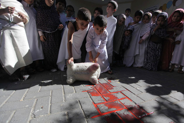 عصر ایران - کودکان فلسطینی در غزه در حال آموزش اعمال و مناسک حج از جمله قربانی کردن هستند. یک گوسفند عروسکی و مایع قرمزی که به جای خون ریخته شده؛ بدین منظور تهیه شده است.