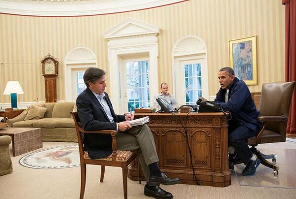 عصر ايران - سايت كاخ سفید این عکس را با عنوان رئیس جمهور باراک اوباما در حال گفتگو با یکی از اعضای تیم مذاکره کننده آمریکا در ژنو منتشر کرده است.