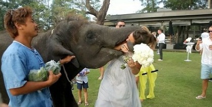 ماجرا از این قرار است که خانمی استرالیایی داشت در گارکی در تایلند بخشی از عروسی خود را برگزار می کرد که فیلی سه ساله به آنها نزدیک شد و خرطومش را به دور گردن عروس پیچاند و آن را تا نزدیک دهان خود برد!