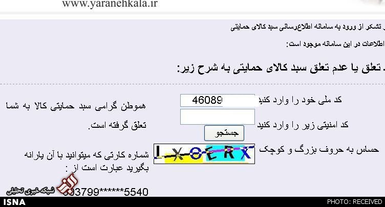 تصویر زیر، سامانه اعلام مشمولان دریافت سبد کالا را به همراه بخشی از کد ملی احمدی‌نژاد نشان می‌دهد که با وارد کردن آن در سامانه مربوطه مشخص شده وی مشمول دریافت سبد کالا شناخته شده است.