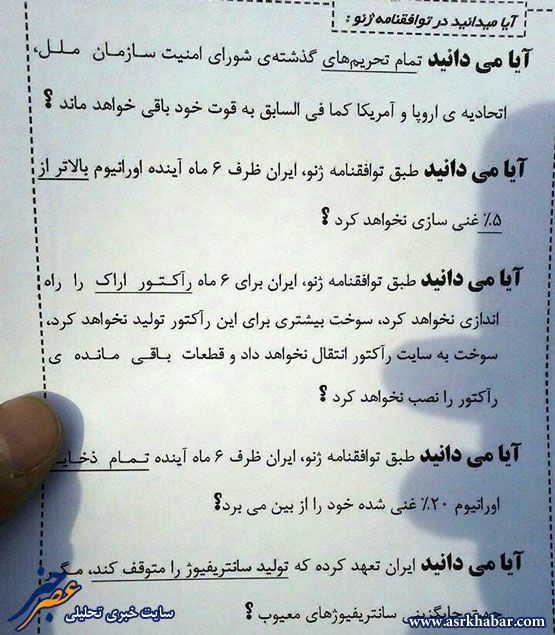 همچنین در این بیانیه ذکر شده که آیا میدانید طبق توافقنامه ژنو، ایران باید دیگر قطعنامههای شورای امنیت را هم به سرانجام رضایتبخشی برساند و این یعنی دخالت آمریکا در برنامه موشکی ایران و دست کشیدن ایران از حمایت حزبالله لبنان که موضوع سایر تحریمها است؟ و در غیر این صورت هیچ تحریمی از تحریمهای شورای امنیت، اروپا و آمریکا برداشته نخواهد شد؟