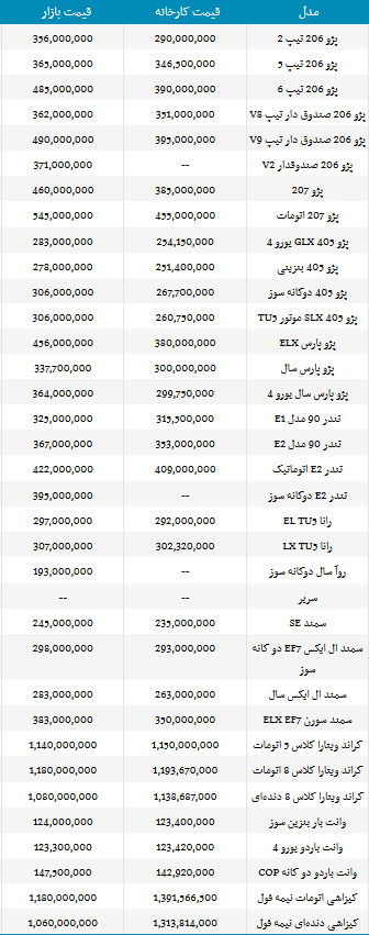 قیمت انواع محصولات "ایران خودرو" (جدول)