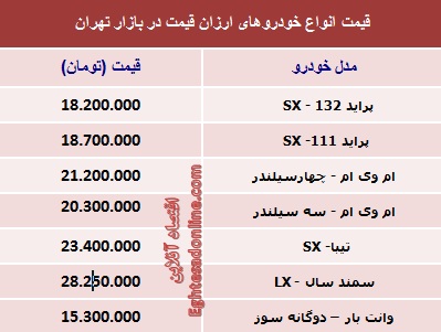 قیمت روز خودروهای صفر ارزان‌ قیمت بازار تهران در روز دوشنبه بیست و ششم اسفند ماه به شرح زیر است؛
