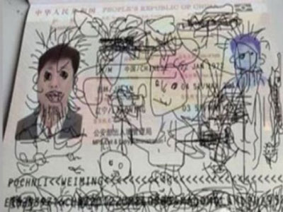 به نوشته روزنامه مترو چاپ لندن، به هنگام سفر خانواده چینی به سمت کره جنوبی، پسر 4 ساله خانواده خود را با نقاشی بر روی گذرنامه پدر مشغول کرده بود.