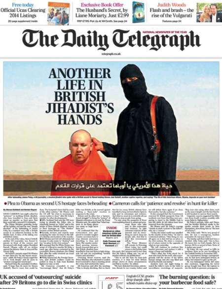 به دنبال انتشار تصاویر ویدئویی بریده شدن سر ˈجیمز فولیˈ خبرنگار آمریکایی توسط یک عضو گروه تروریستی داعش که به گفته دیوید کامرون نخست وزیر انگلیس احتمال می رود تبعه این کشور باشد، این خبر درصدر خبرهای رسانه های گروهی بریتانیا قرار گرفته است.
