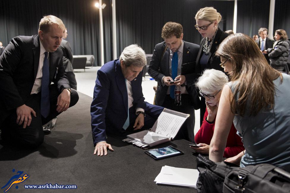 جان کری و شرمن در حال مشاهده کنفرانس خبری اوباما پس از قرائت بیانیه
