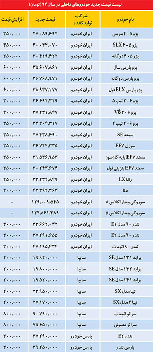 خودروسازان کشور در حالی قیمت محصولات خود را در سال 94 اعلام کردند که بر این اساس، حداقل 200 هزار تومان و حداکثر 800 هزار تومان به قیمت خودروهای داخلی اضافه شده است. آن طور که از نمایندگیهای رسمی خودروسازان خبر میرسد، قیمت خودروهای داخلی از دیروز و متناسب با هزینههای دولتی شامل «مالیات بر ارزش افزوده»، «بیمه»، «شمارهگذاری» و همچنین هزینه «خدمات پس از فروش» افزایش یافته است. این در شرایطی است که گفته میشود خودروسازان بهزودی درخواست افزایش قیمتی دوباره را به شورای رقابت خواهند فرستاد.