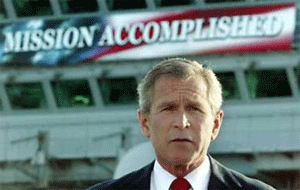 به گزارش عصر ایران (asriran.com) به نقل از آسوشیتدپرس، رییس جمهوری آمریکا در می 2003 در حالی که یک تابلو با مضمون «ماموریت به پایان رسید» در پشت سرش خودنمایی می کرد بر روی ناو هواپیمابر «یو اس اس آبراهام لینکلن» گفت: "عملیات اصلی نظامی در عراق خاتمه یافته است."