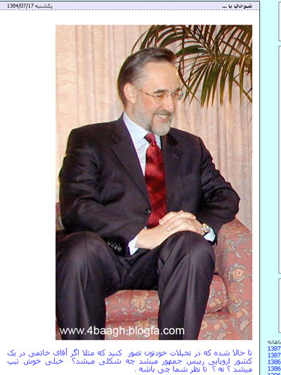 با کلیک بر روی عکس مذکور، عکسی فوتوشاپی از خاتمی در وبلاگی با نام "چهار باغ" ظاهر می شود که تاریخ 1384.07.17 بر روی آن دیده می شود. در این مطلب نویسنده آورده است: