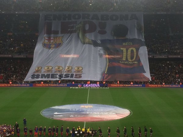 هواداران بارسا با به نمایش گذاشتن یک بنر بسیار بزرگ، از لیونل مسی برای دریافت پنجمین توپ طلایش تقدیر کردند. روی این بنر تصویری از مسی در کنار 5 توپ طلا دیده می شود و بالای آن هم به زبان کاتالانی نوشته شده:" تبریک لئو!"