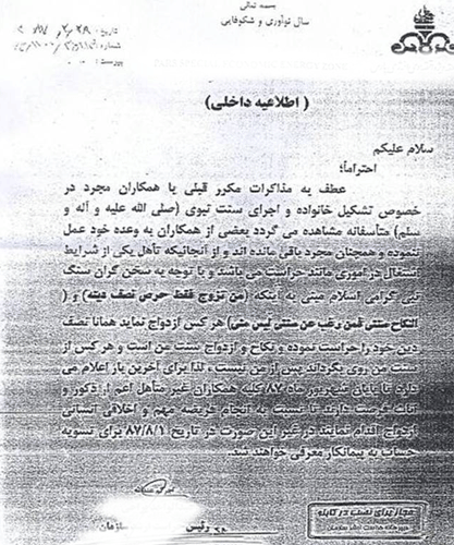 عطف به مذاکرات مکرر قبلی با همکاران مجرد در خصوص تشکیل خانواده و اجرای سنت نبوی (ص) متاسفانه مشاهدهمی گردد بعضی همکاران به وعده خود عمل نموده و همچنان مجرد باقی مانده اند و از آنجا که تأهل یکی از شرایط اشتغال در اموری مانند حراست می باشد و با توجه به این سخن نبی گرامی اسلام مبنی به اینکه ( من تزوج فقط "فقد" تزوج نصف دینه) و ( النکاح سنتی فمن رغب عن سنتی لیس منی) هرکس ازدواج نماید همانانصف دین خود را حراست نموده و نکاح و ازدواج سنت من است و هر کس از سنت من روی بگرداند پس از من نیست ، لذا برای آخرین بار اعلام می دارد تا پایان شهریور 87 کلیه همکاران غیر متأهل اعم از ذکور و اناث فرصت دارند تا نسبت به انجام فریضه مهم و اخلاقی ازدواج اقدام نمایند . در غیر این صورت در تاریخ 87/8/1 برای تسویه حساب به پیمانکار معرفی خواهند شد .