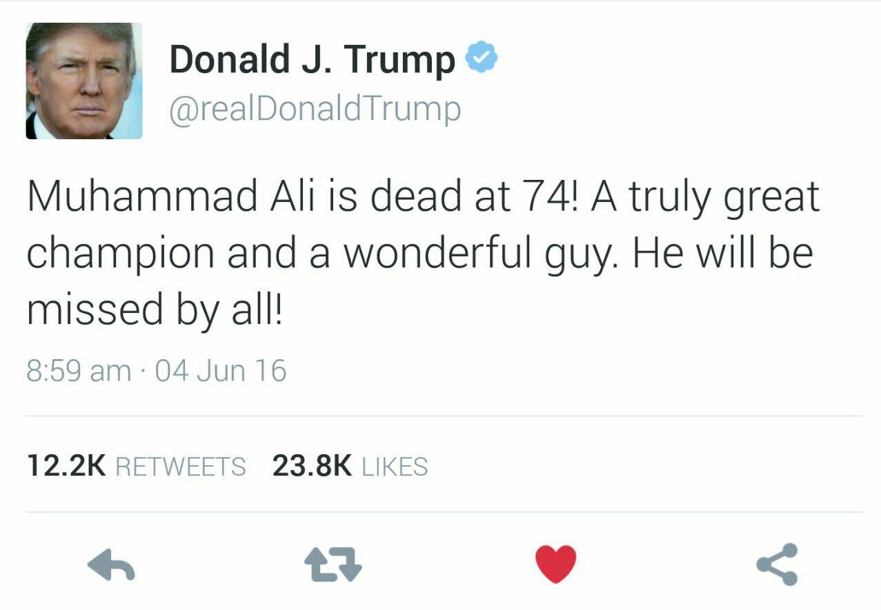 دونالد ترامپ نامزد جمهوریخواهان در انتخابات ریاست جمهوری آمریکا در سال 2016 با انشتار پستی نسبت به درگذشت محمدعلی، اسطوره بوکس حرفه ای جهان واکنش نشان داد.