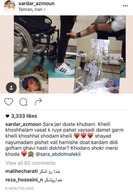 سردار آزمون، ملی پوش کشورمان که در دیدار برابر قرقیزستان نیز موفق شد زننده یکی از گل های ایران لقب گیرد در صفحه اینستاگرام خود بابت اینکه سارا عبدالمالکی موفق شده سلامتی خود را بازیابد و بار دیگر روی پای خود بایستد ابراز خوشحالی کرده است. مهاجم جوان تیم ملی که پیش از این نیز با حضور در بیمارستان به ملاقات این ملی پوش راگبی کشورمان رفته بود در این پیام برای او نوشته: خیلی خوشحالم که روی پای خودت ایستاده ای و دمت گرم...شاید پیشت نیومدم اما همیشه برات دعا کردم و ...