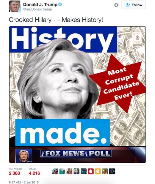 این در حالی است که این کار برای وی گران تمام شده و به جای هدف «ترامپ» که تبلیغ سوء علیه «کلینتون» بود، ستاره داود کنار تصویر این نامزد انتخاباتی دردسر ساز شد و منتقدین «ترامپ» از وی به خاطر رفتار نژادپرستانه وی که به گفته آنها ریشه در جنگ جهانی دوم دارد، به شدت انتقاد کردند.